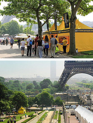 De gele tenten van de Franse Pastoraal Werkers rijzen overal in Parijs op om hulp te brengen.
